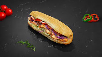 Chicken, tomatoes, pickles, jalapeños, ice berg lettuce, carrot, onions, garlic sauce, homemade red sauce, bread.